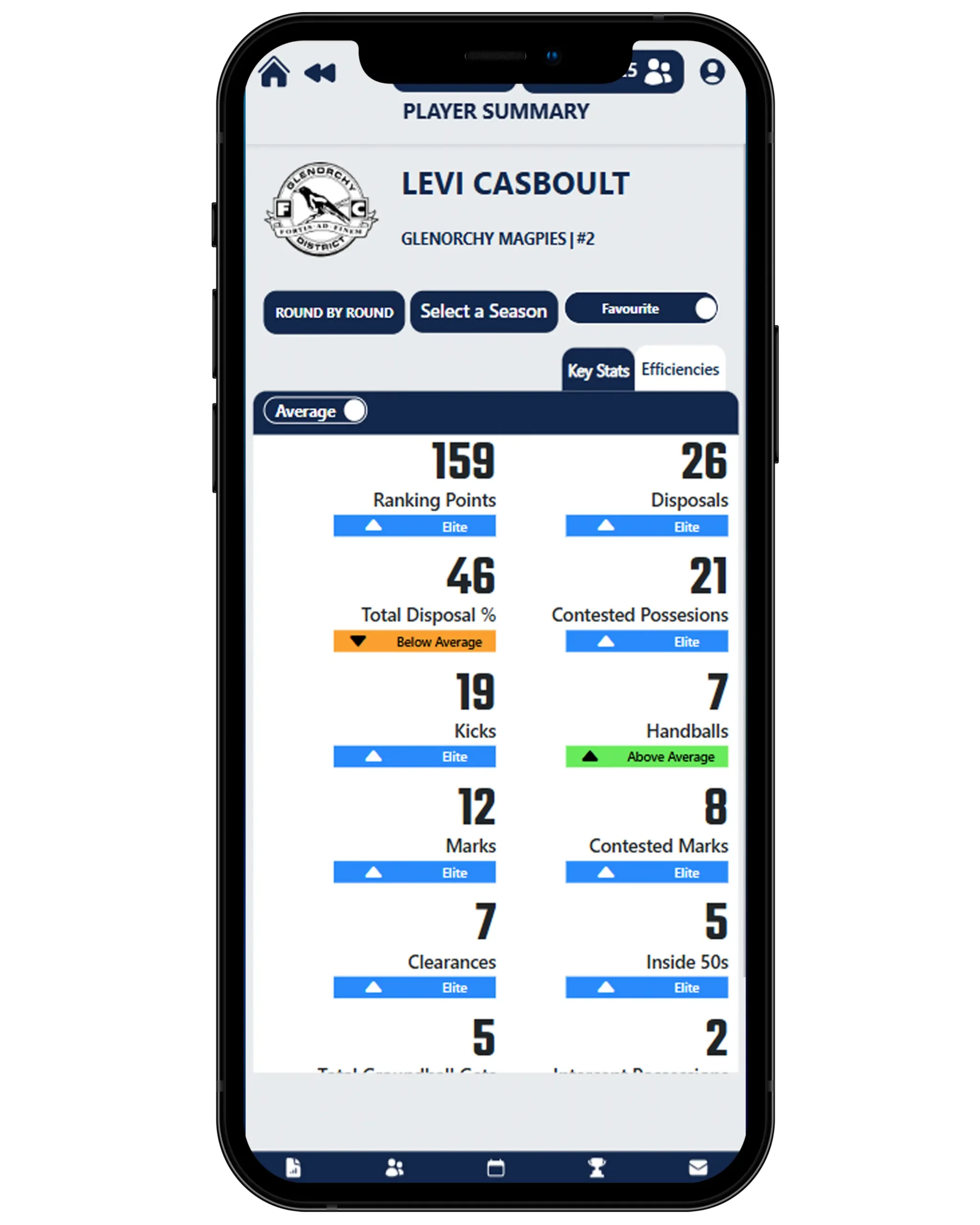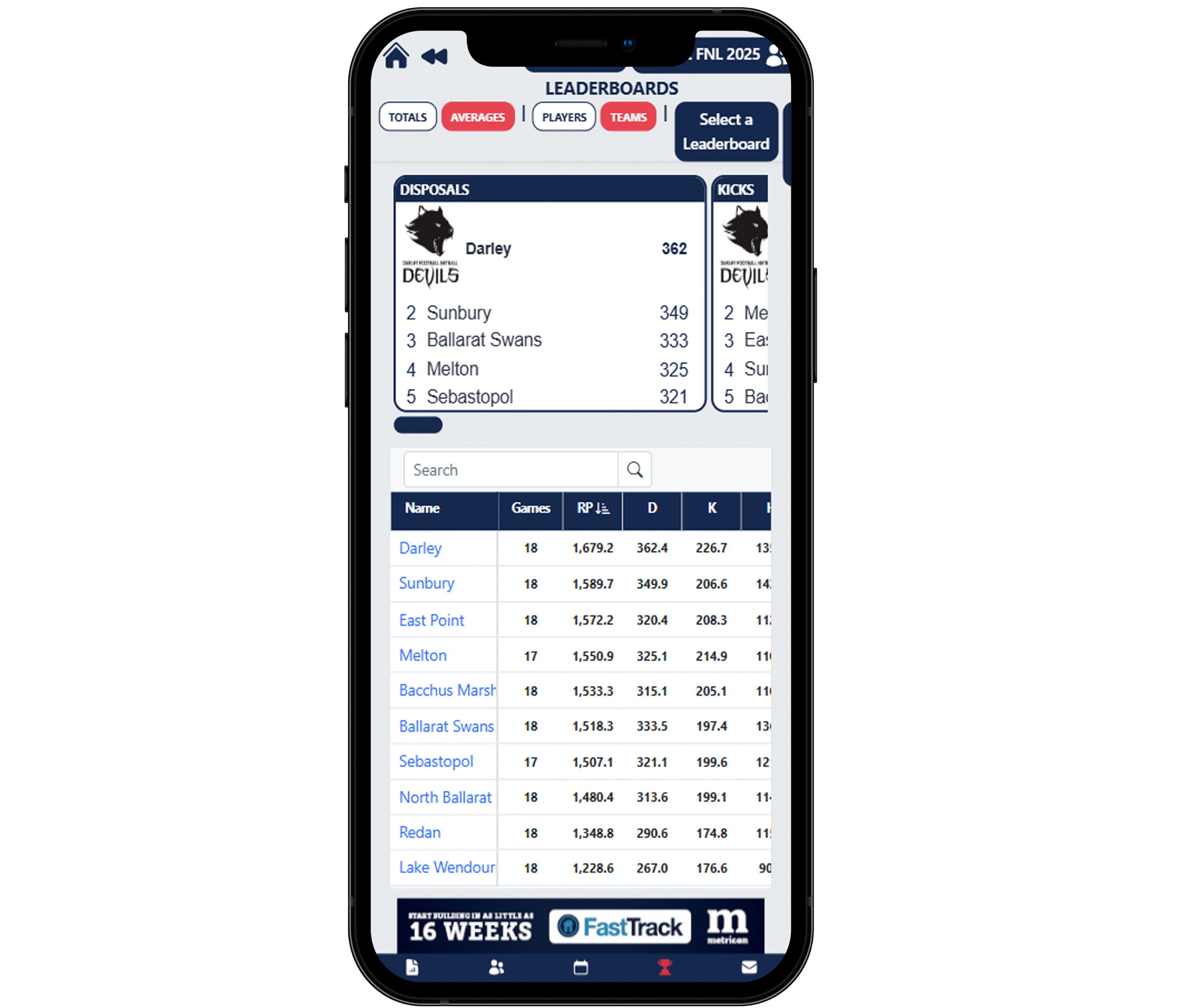 Players can view detailed team and individual match stats, plus compare themselves to others via dynamic leaderboards filtered by stat, team, round, and averages.